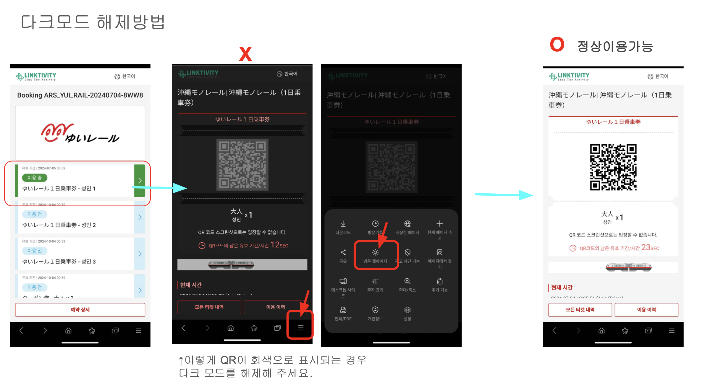 복수의 QR코드 중 일부 QR만 비활성화 된 경우(QR이 회색으로 보여요, 1번째 QR은 인식되는데 2번째는 인식이 안되요 등의 질문): 삼성기종, 삼성 기본 브라우저, 다크 모드 사용하는 경우 발생할 가능성이 높으므로, 다크모드 해제 or 타브라우저 사용하도록 안내 부탁드립니다.