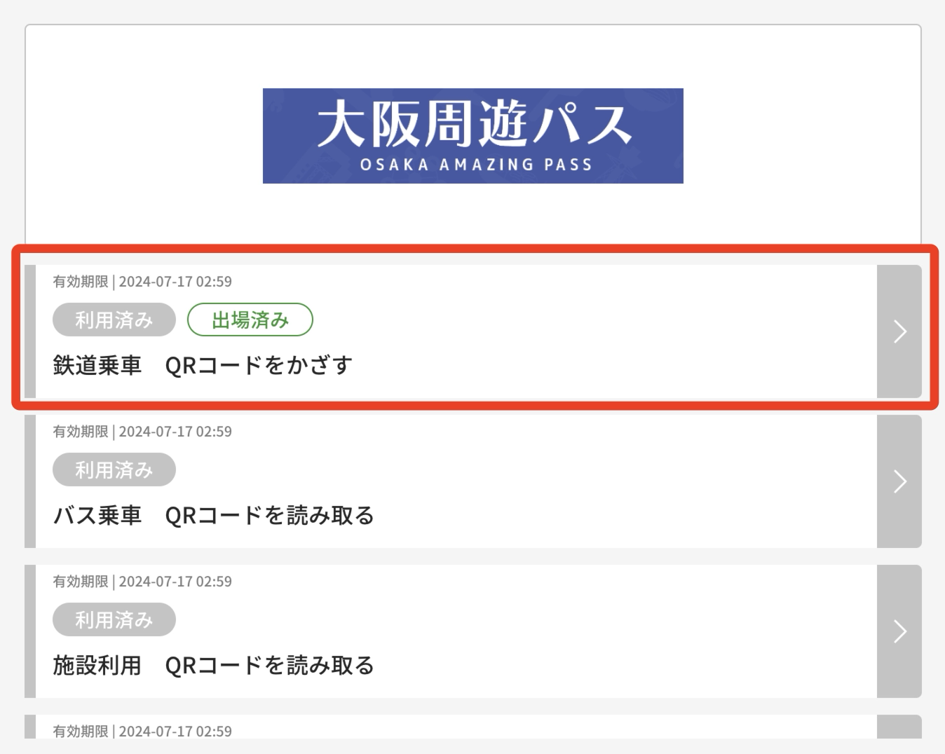 입장 시 개찰구 에러가 발생한 경우, 티켓의 '이용 내역'에서 승하차 기록을 확인하면 이전에 들어간 기록은 있으나 나온 기록이 없을 가능성이 높습니다. 이 때, 언어를 일본어로 설정 후 역무원에게 직접 바우처를 제시하여 수정을 요청해주셔야합니다.