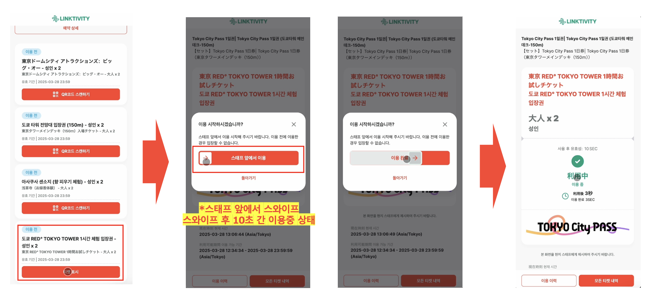 스태프 앞에서 스와이프 하여 이용중 상태가 된 입장권은, 10초 후 이용 완료 처리됩니다.