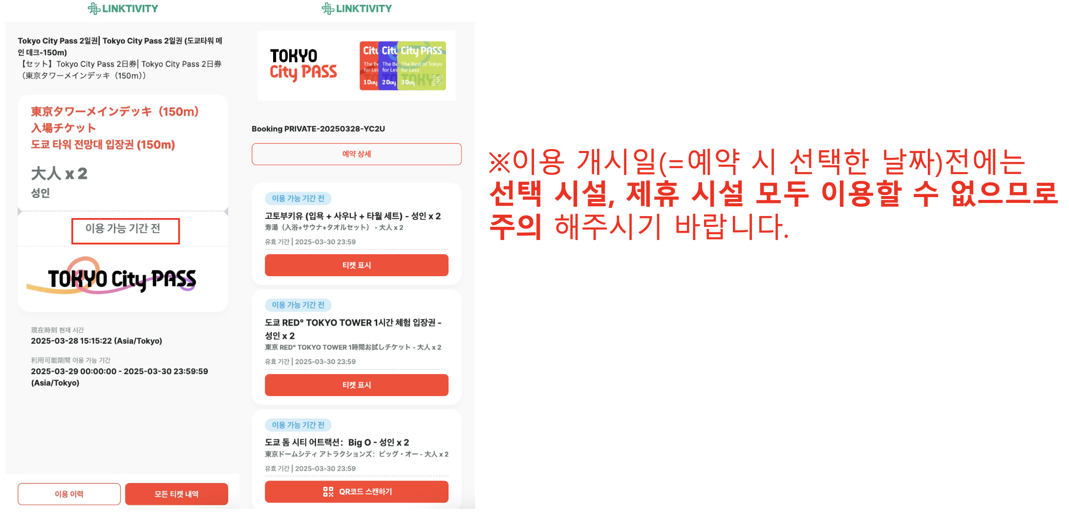 하기와 같이 바우처 링크를 열었을 때 모든 티켓이 [이용가능 기간 전]이라고 표시됩니다.