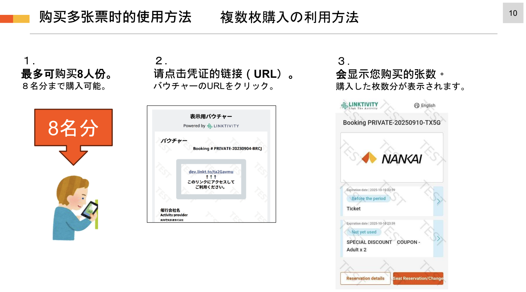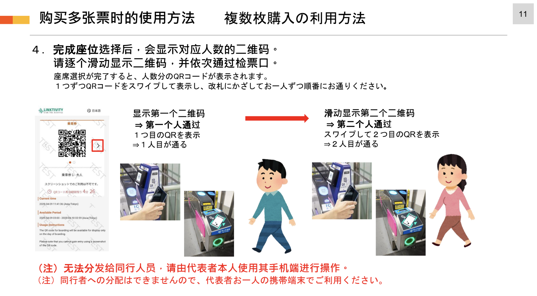 ※ 完成座位预订后,通过凭证 URL 点击票券即可显示二维码(可在乘车当日凌晨4点起使用)。系统设置允许按照购买数量进行刷票。请在同一设备上刷票,每人依次通过检票口。